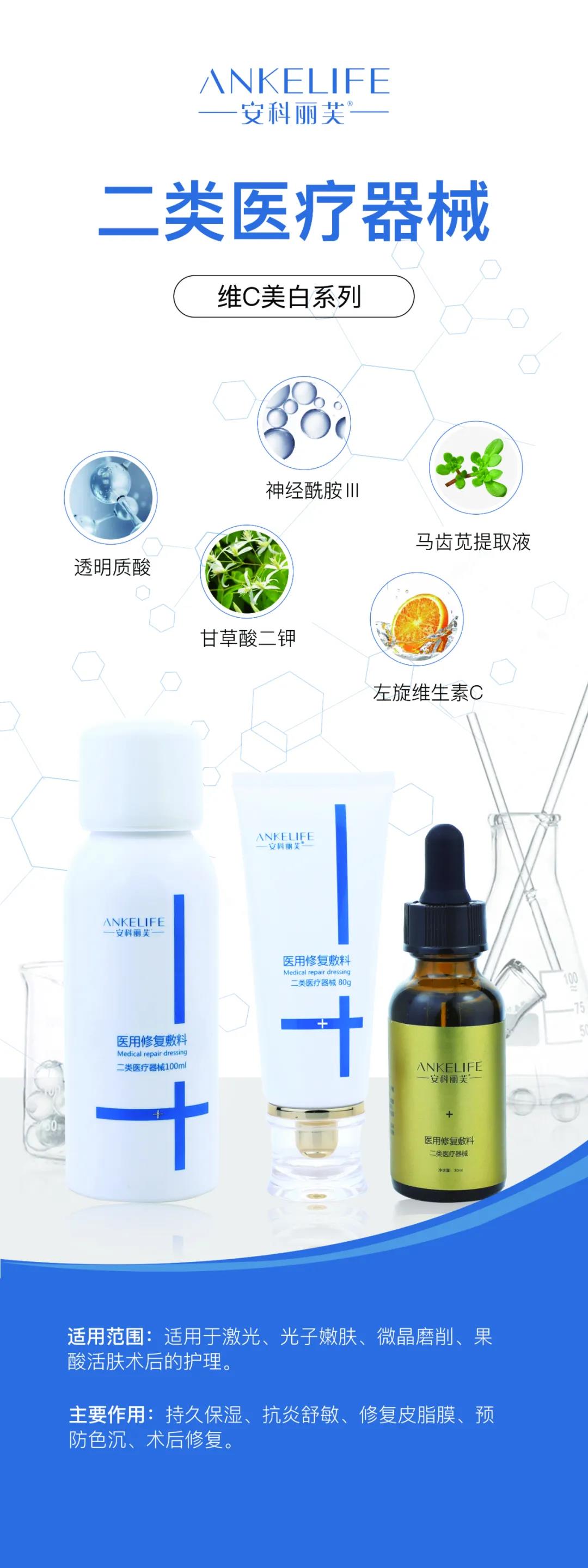 打完水光針后,可以借助安科麗的二類醫(yī)用修復(fù)敷料幫助修復(fù)皮膚屏障功能,搭配VC噴霧,VC精華,VC乳液一起使用,促進微創(chuàng)傷口愈合,使水光針的效果維持更久,皮膚術(shù)后更舒適。